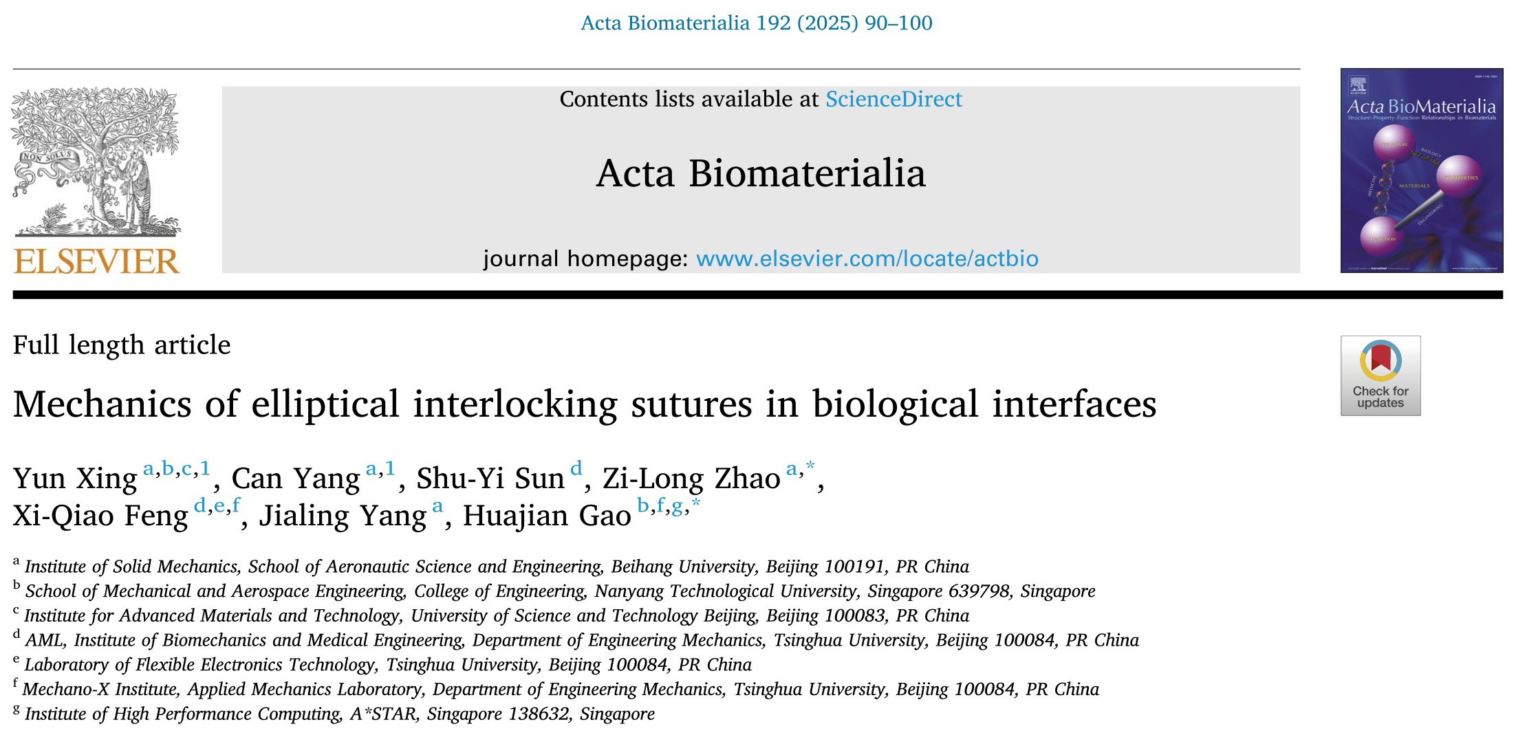 近日,我院赵子龙教授、杨嘉陵教授及其合作者在生物材料学顶级期刊《Acta Biomaterialia》发表论文《Mechanics of elliptical interlocking sutures in biological interfaces》。他们针对生物互锁界面开展研究,将甲虫翅鞘的椭圆型骨缝结构作为研究对象,建立了可以精确预测结构拉拔与失效行为的力学模型,揭示了此类结构的强韧化与优化机理。