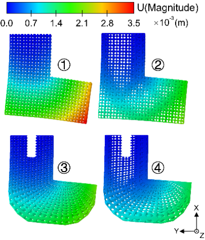该研究通过有限元分析及力学试验测试对设计结果进行了系统验证。相较于传统TPMS均布点阵和均匀点阵,经过拓扑优化与各向异性设计的共形梯度点阵结构在抗变形能力等关键性能指标上展现出显著提升(如图3 ),同时传力路径得到优化。这一创新设计方法凭借其跨尺度优化能力,有效降低了设计复杂度并提升了性能边界,为TPMS梯度结构的工程应用提供了高效且可靠的解决方案。