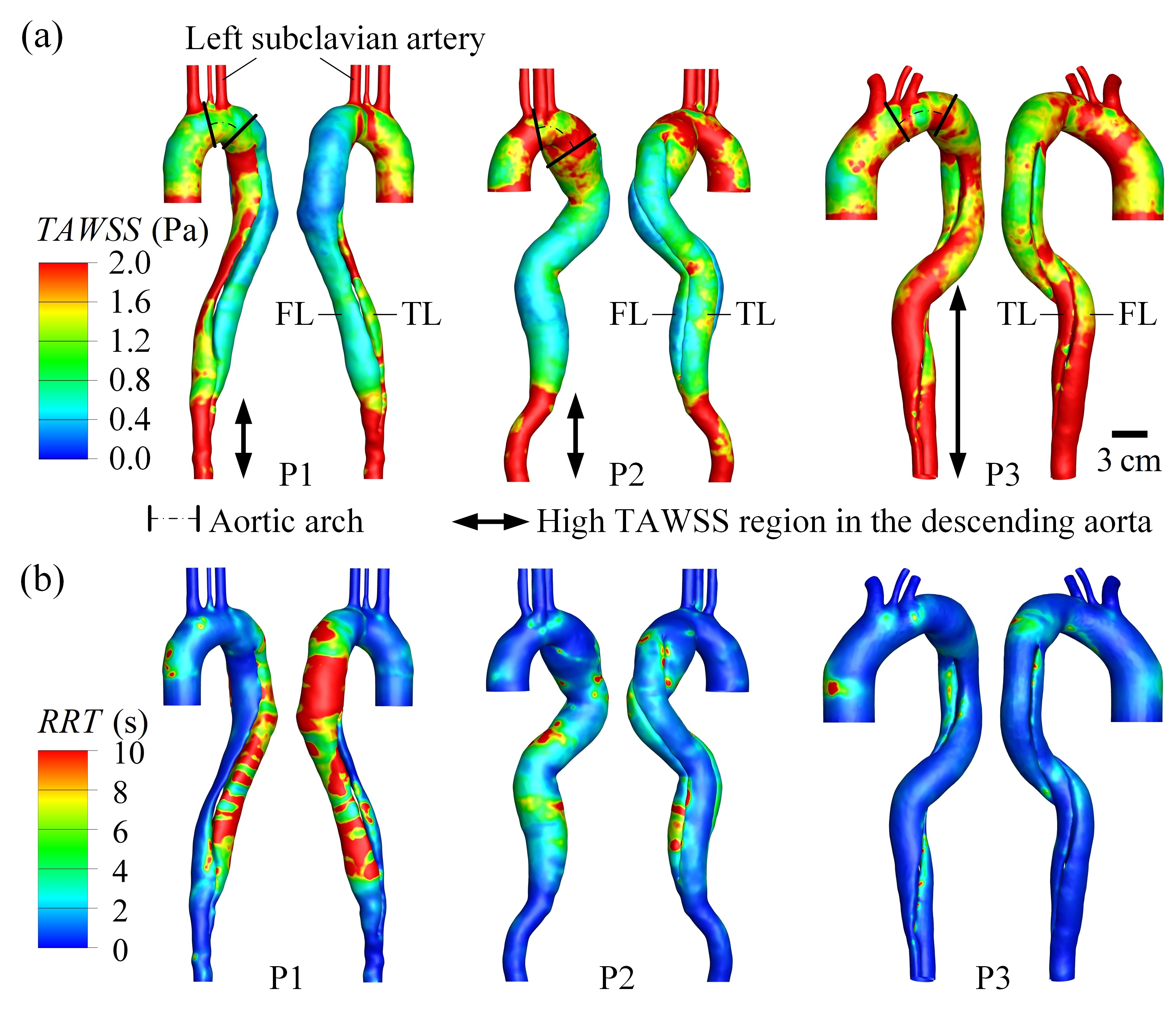 图3展示了不同螺旋程度的主动脉在时均壁面切应力和血液相对滞留时间等方面的分布差异。可以看到,弱手性模型(P1)假腔区域的应力水平显著低于强手性模型(P3),表明弱手性模型假腔扩张的风险较低。血液在弱手性假腔中的滞留时间更长,表明其更易形成血栓,更有可能获得好的术后预后。