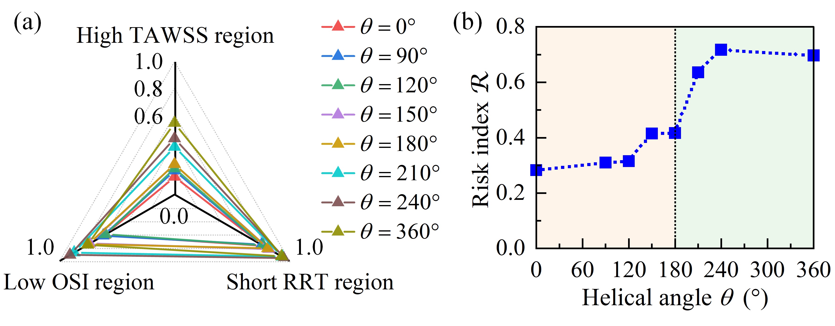 研究团队进一步探究了TBAD螺旋程度对临床风险的影响。如图5a所示,随着螺旋角的增大,高时均壁面切应力区域扩大,血液的相对滞留时间缩短。这意味着,强手性TBAD更易触发假腔扩张。当螺旋角超过180°时,风险指数骤升(图5b),该阈值可为临床干预提供参考。