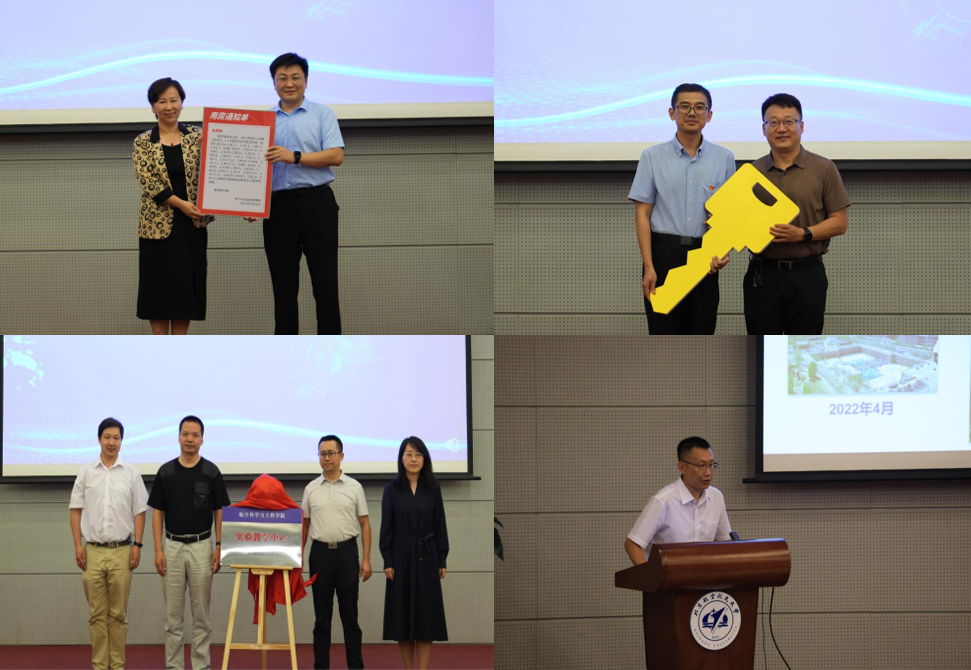首先进行的是航空学院搬迁沙河校区启动仪式。资产与实验室管理处刘刚处长向航空学院党委书记鲍蕊移交航空学院大楼用房通知单,总务部邹煜良部长向航空学院院长潘翀移交航空学院大楼钥匙,教务部钱政部长、金天副部长与航空学院罗明强、邵丽华副院长共同为航空学院实验教学中心揭牌,航空学院靳海川副院长向在场的领导老师们介绍了学院搬迁工作进展、下一步搬迁工作计划等。按照计划,航空学院将于2024年8月前,完成全部搬迁沙河校区工作。