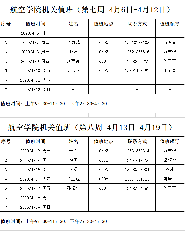 航空学院机关值班(第七-八周 4月6日-4月19日)