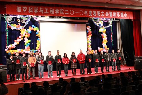 穿插于新年晚会中的两个颁奖环节也是整台晚会的亮点,对航空学院2010年本科生、研究生的优秀团体和个人进行了表彰。包括本科卫生标兵宿舍、研究生明星工作室、学院优秀班集体、学院优秀学生团队、学习进步奖、优秀导生、社会实践先进个人、优秀学生党员和学院十佳明星。藉颁奖晚会的契机,充分展现了航空学院一年来在学生培养方面等方面取得的丰硕成果,学院高举“创先争优”大旗,巩固党建和思想政治教育工作龙头地位;着力建设服务育人体系,营造优良学风,鼓励科技创新,打造精品服务,弘扬校园文化;借助两地办学良好契机,促进沙河校区平稳运行,服务保障渐入佳境,教育管理日臻完善,校区文化薪火相传。