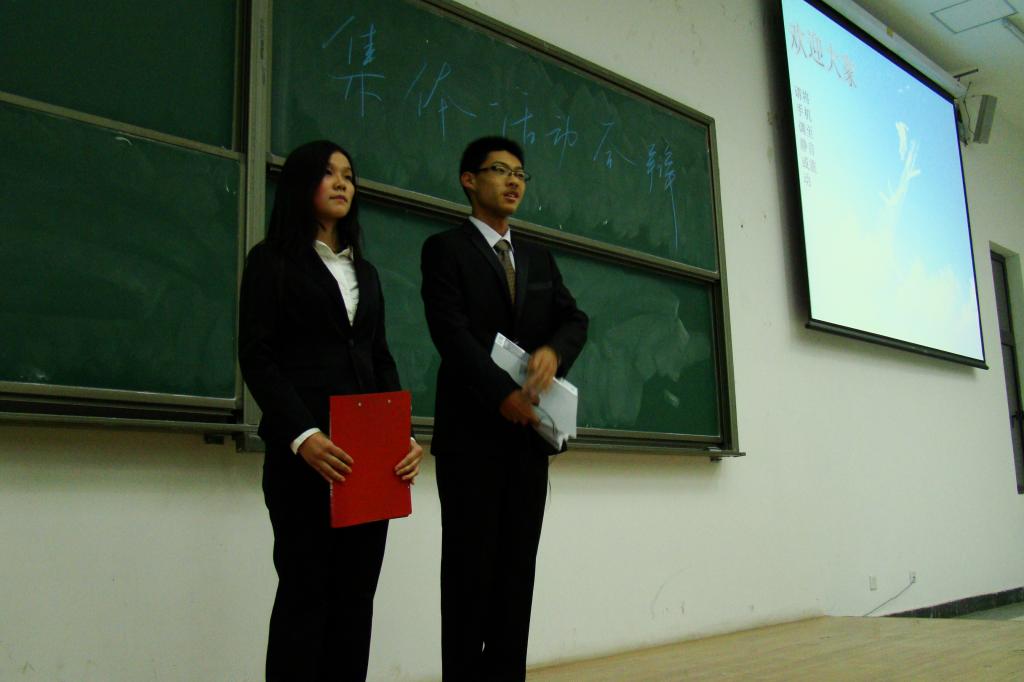 主持人宣布评选开始 评委组 正在展示的15班 12班在演讲 1105大班新生班集体答辩赛顺利结束 2011年11月4日晚7点,航空学院于J0-001举行了新生优秀班集体答辩活动预赛。